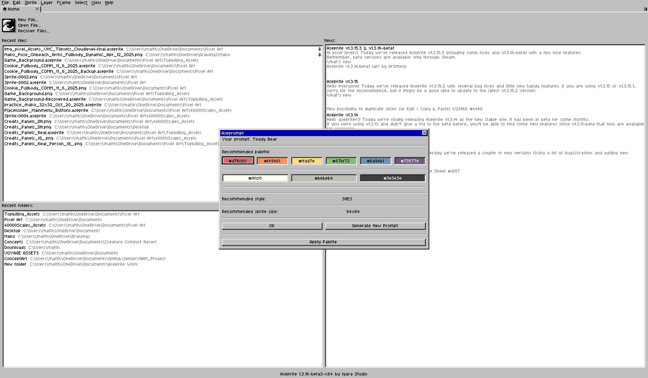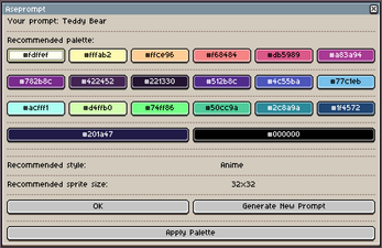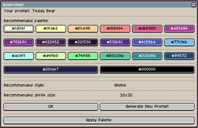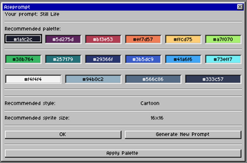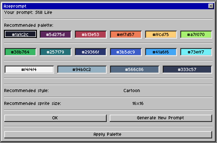 Aseprompt is a art prompt generator script for Aseprite that can generate a text prompt, a recommended palette and a recommended file size!